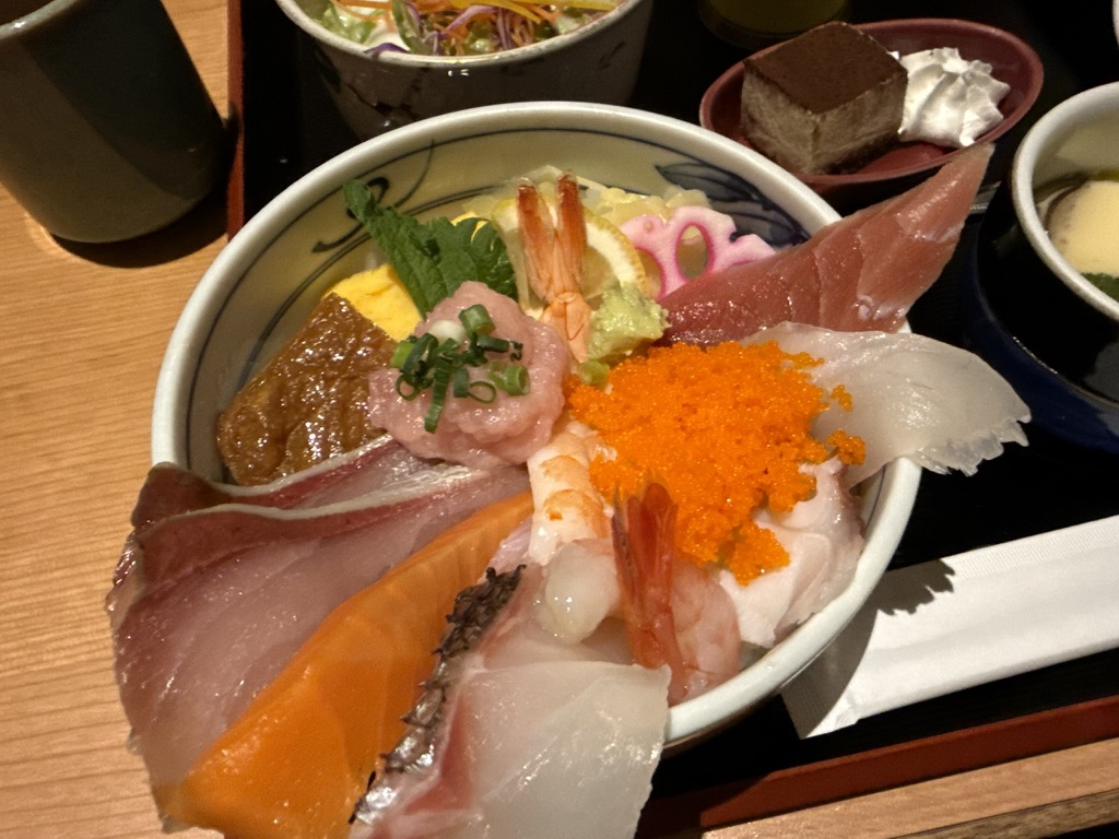写真の海鮮丼のほかに、天ぷら・茶碗蒸し・味噌汁・デザートも付いていて大満足でした!
