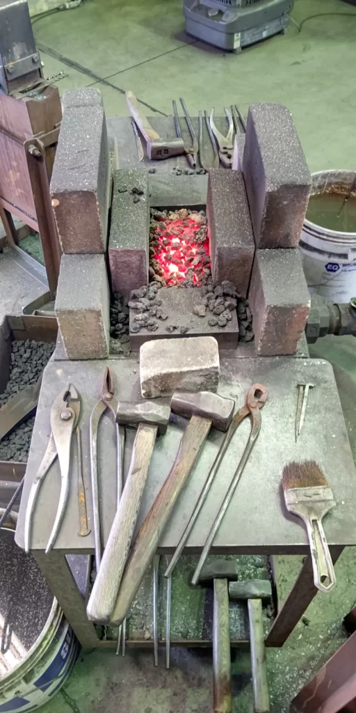 エプロンと保護メガネを装着し、熱した鉄を叩く姿は真剣そのもの。
